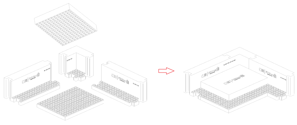 Wärmeisolationssystem der Fundamentplatte JUBHome BASE ist zusammengesetzt aus Wärmeisolationswanne, in die ohne Schallung, der Stahlbeton der Fundamentplatte eingebaut wird und aus dem Erdreich das sich um das Objekt befindet. Wärmeisolationswanne des Systems JUBHome BASE beinhaltet obere und untere Bodenelemente, Linienrandelemente und Eckrandelemente. Die Letzteren dienen nicht nur als Wärmeisolation sondern auch als Einwegschallung der Fundamentplatte. (Bild 1.)