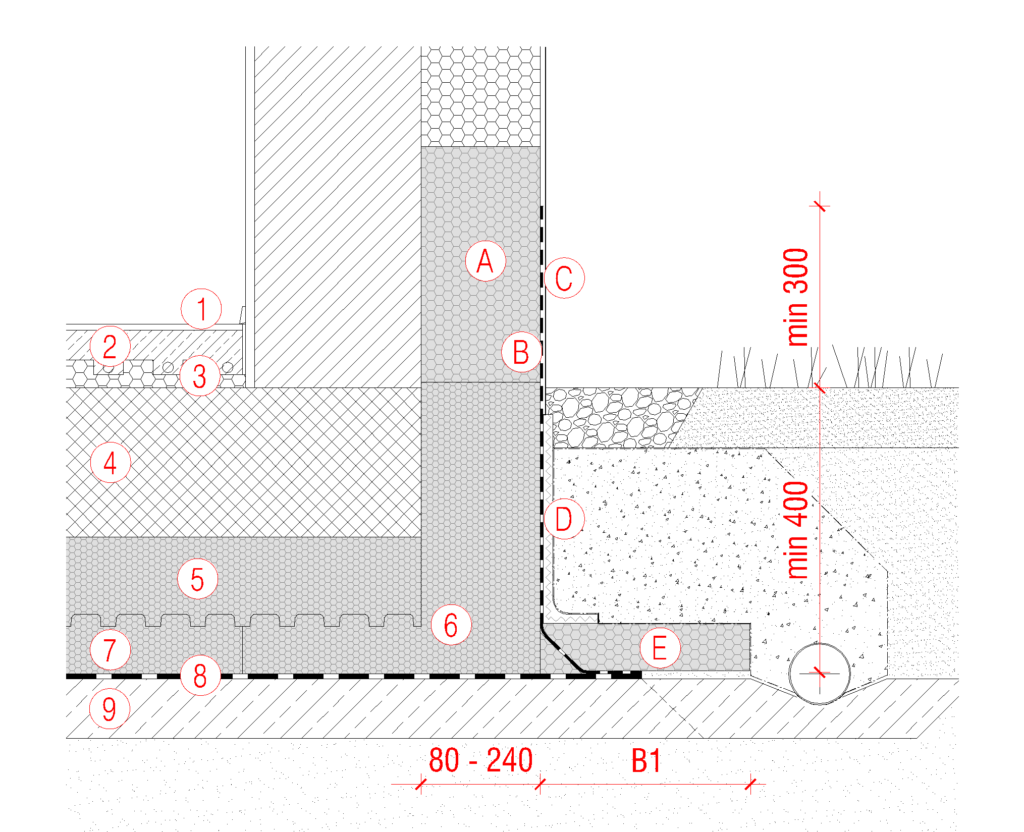 In der Gefrierzone, muss wegen der Fundamentierungsarbeiten, am Rand der Wärmeisolationsfundamentplatten, die Wärmeisolation des Erdreiches ausgeführt werden. Die Isolation verhindert Entstehung der Eiszapfen und damit die Beschädigung der Hydroisolation und in der Tauzeit die Ausspülung der Feinteile. Abhängig von der Durchschnittslufttemperatur an Ort und Stelle, wird die Isolation gürtelartig, in angegebener Breite und Stärke, mit Hilfe der lose verlegten Platten JUBIYOL EPS F Strong Premium S0, ausgeführt.