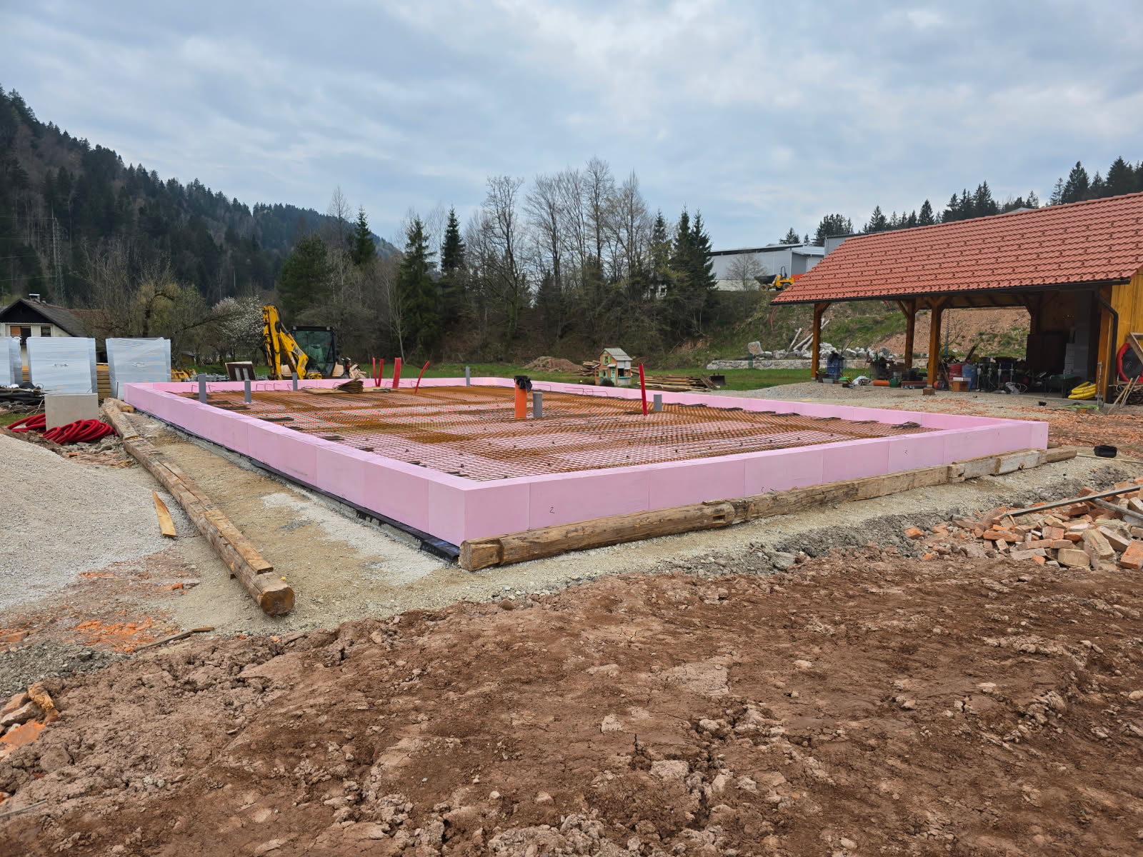 Na fotografiji je prikaz sestavljenega BASE sistema v Žirovnici, kjer bo kmalu zrasla nova sodobna hiša, grajena s sistemi JUBHome BASE in WALL. Projekt lepo napreduje – v tem tednu se bo izvedlo betoniranje temeljne plošče, nato pa nadaljujemo z gradnjo prve etaže.